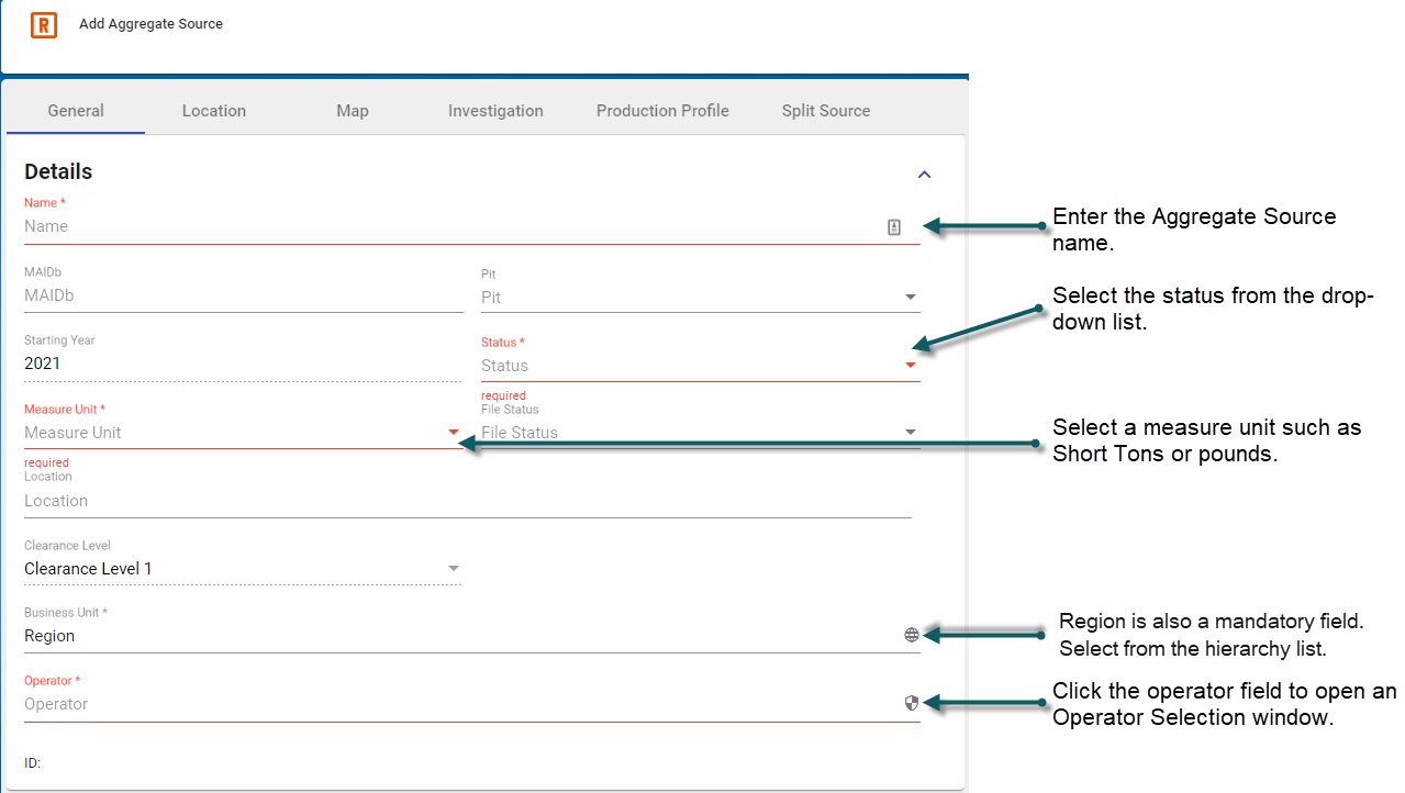 With the Add Aggregate Source form open and in the General Tab > Details section, enter relevant details. Note: Red-highlighted sections are mandatory.