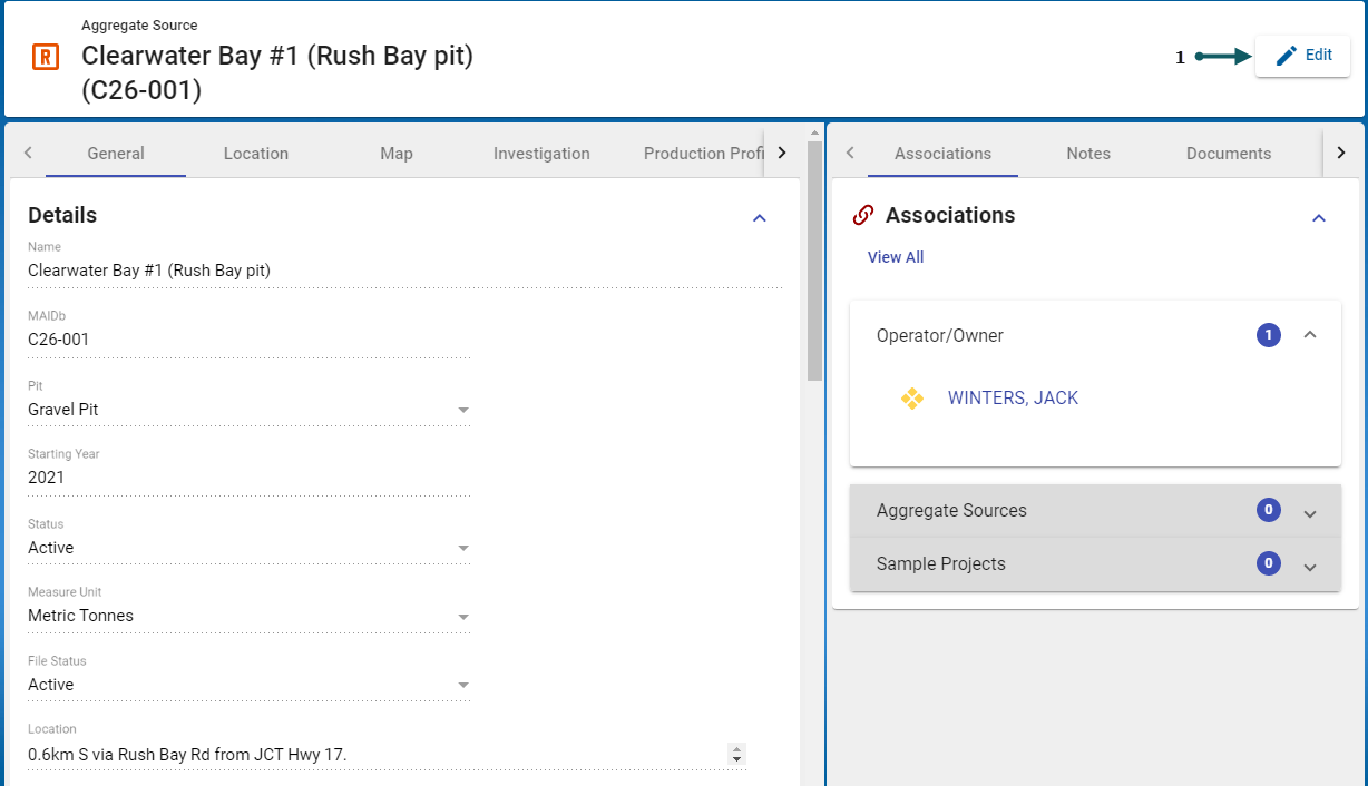 With the Add Aggregate Source form open and in the General Tab > Details section, select the Edit button (1).
