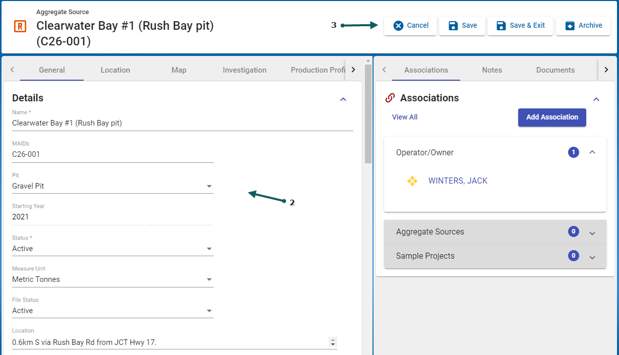 Update the fields that should be changed (2) and when finished, changes can either be saved, cancelled or the record can be archived (3)