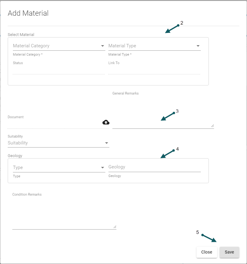 First select the Material Category then the Material Type (2), enter other optional material attributes (3) such as General Remarks and Suitability, a document can also be added. Other optional attributes such as the Geology Type and description can also be added (4). Then click save (5) to continue.
