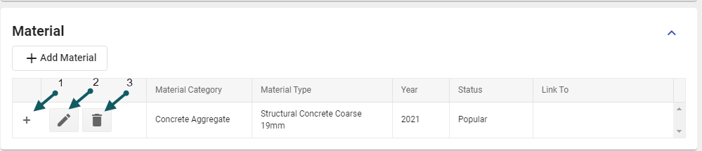 Once saved, the materials can be maintained in the edit view. Click the + sign (1) to expand, click the pencil (2) to edit, click the delete button (3) to remove: