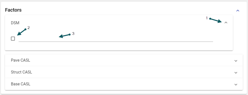Factors are used to note certain things on the site. Click the chevron (1) to expand, Click the checkbox (2), then enter text (3)