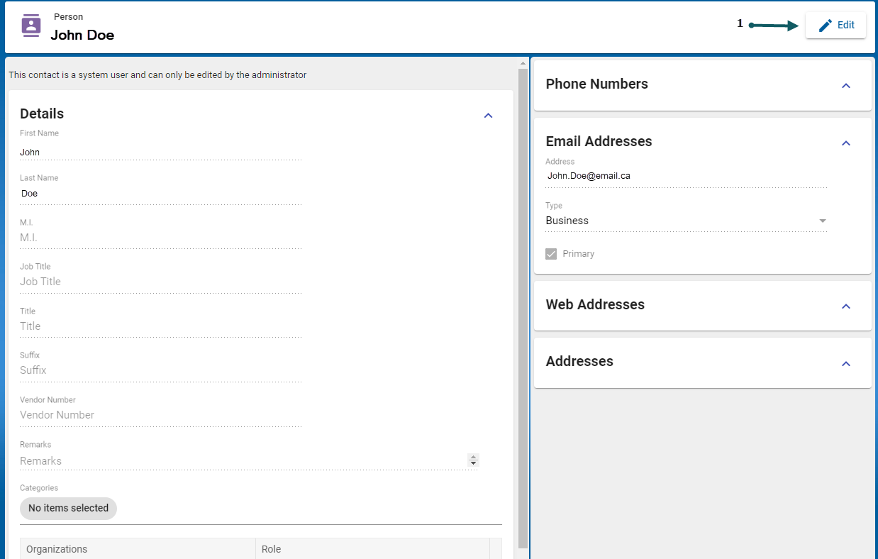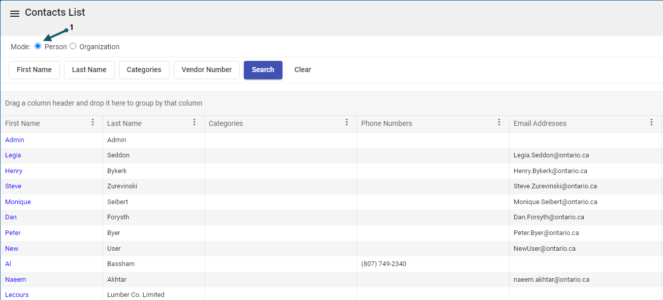 The purpose of the Agreement Contacts module is to maintain and organize a list of all Contacts. These contacts are used by forms in the Integral - LIS application. There are two categories of contacts: (1) Person Contacts and (2) Organization Contacts. Details include: contact name, vendor number, phone number and email address.