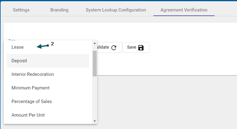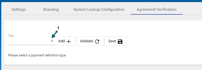 In the Config form and in the Agreement Verification tab, Select the Payment Definition Type (1) from the drop-down, then click the corresponding type (2)