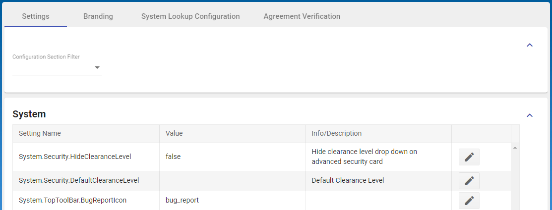 The Configs Module manages a number of settings in the Integral-LIS system. There are 7 configuration groups that can be selected using the drop-down. The setting groups that can be changed are: System, Agreement, Document, Reserve, Branding, Audit and User.