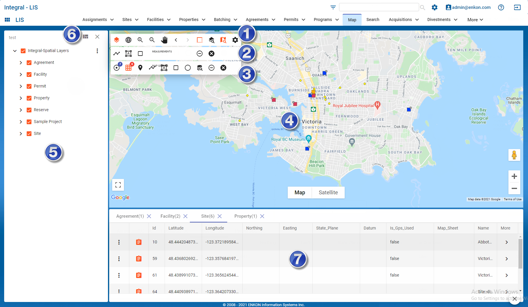 The Map Viewer interface is comprised of 7 main components as shown below.