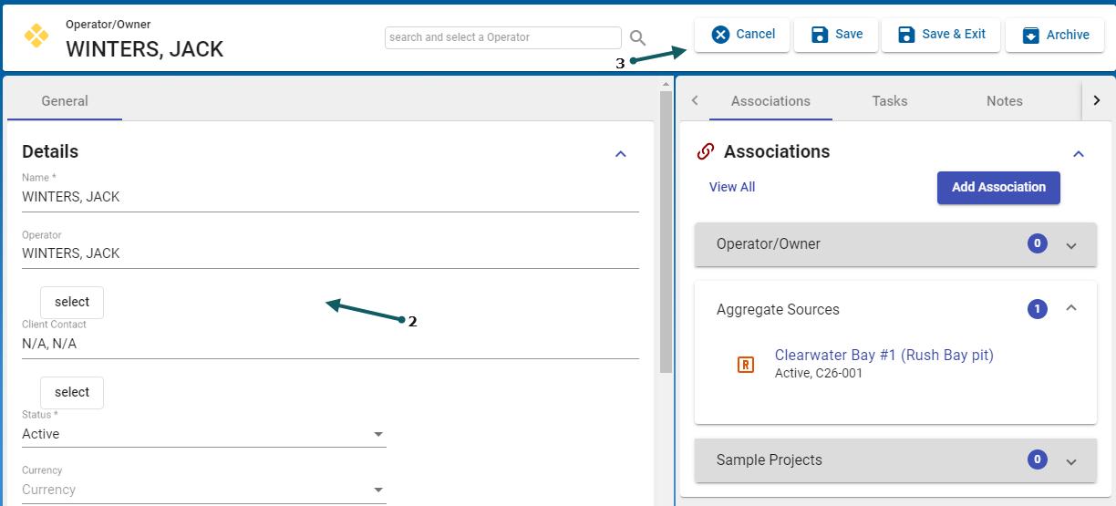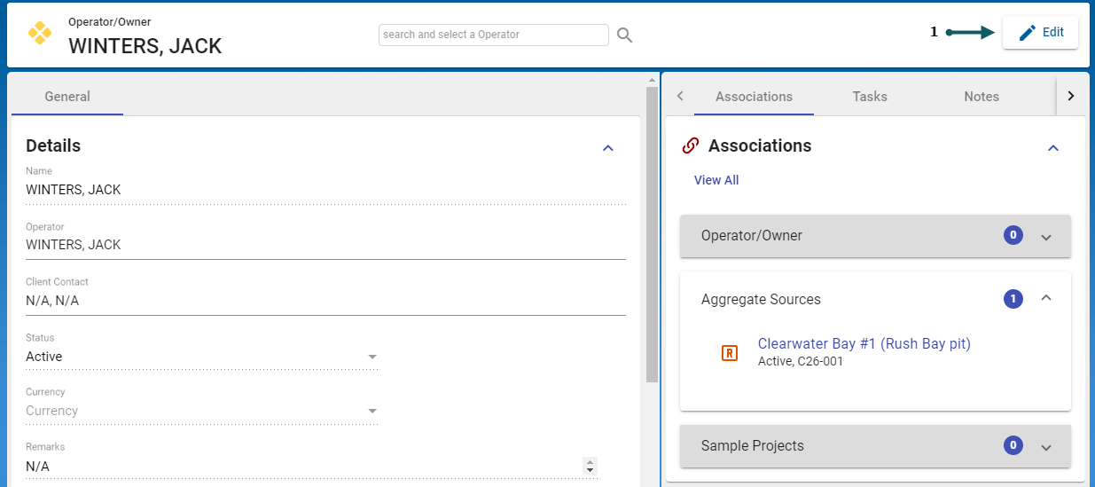 With the Operator/Owner form open and in the General Tab > Details section, select the Edit button (1).
