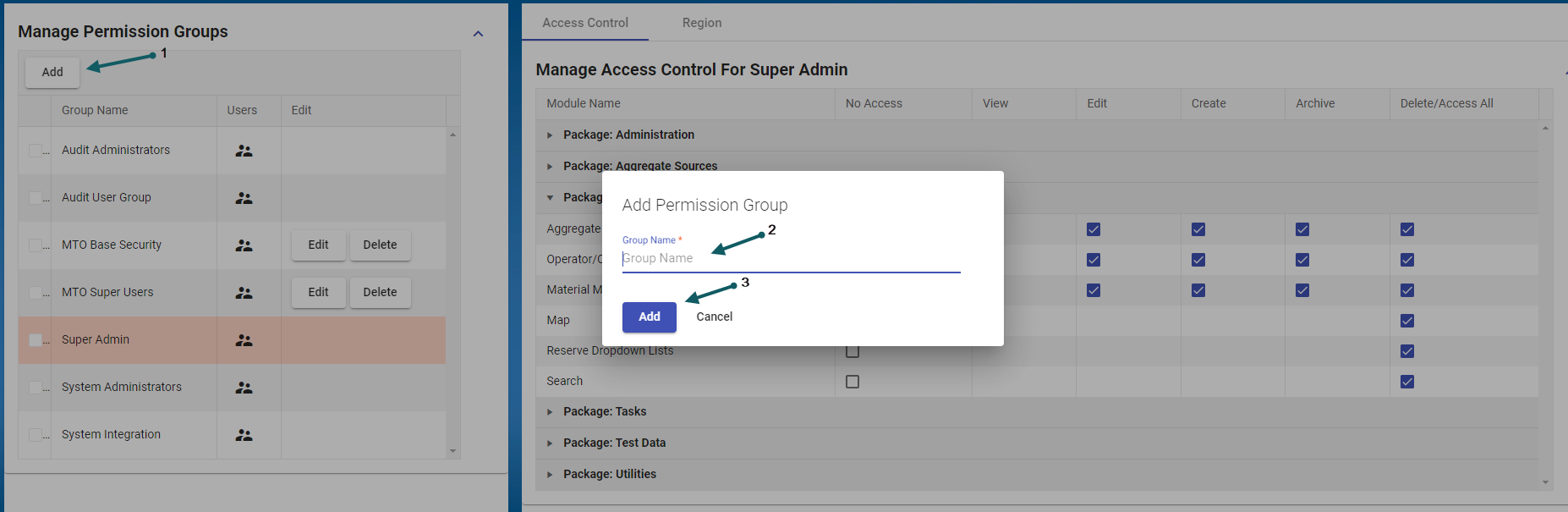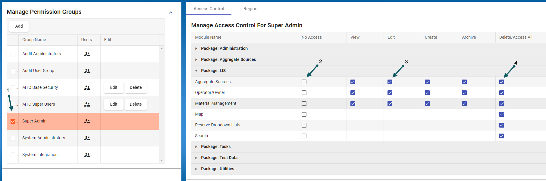 Select the name of the Permission Group (1) of interest. Remove all access permissions by selecting No Access (2). Select: View, Edit, Create or Archive to grant the corresponding privilege (3). Grant full access, including Delete by selecting Delete/Access All (4).