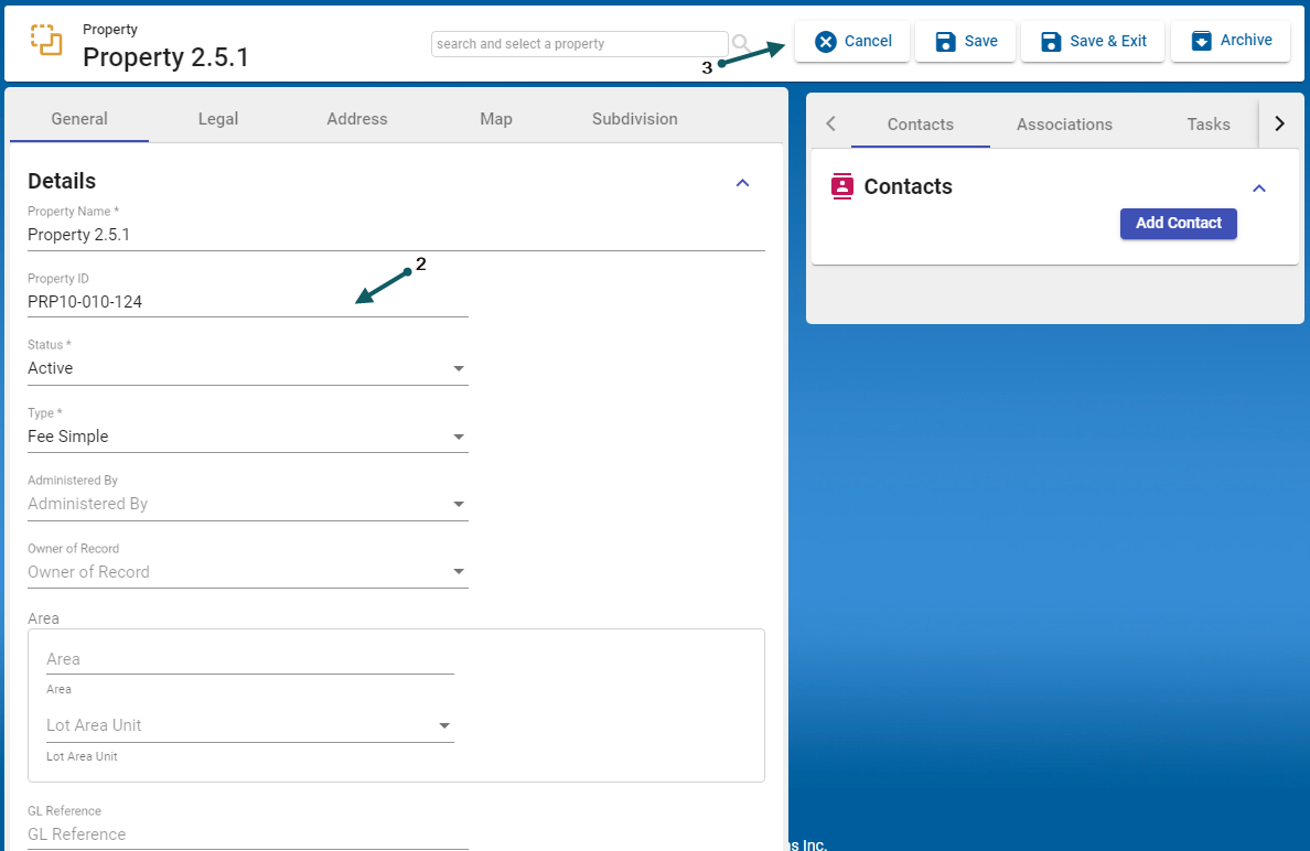 • Update the fields to be changed (2) and when finished, changes can either be saved, cancelled or the record can be archived (3)