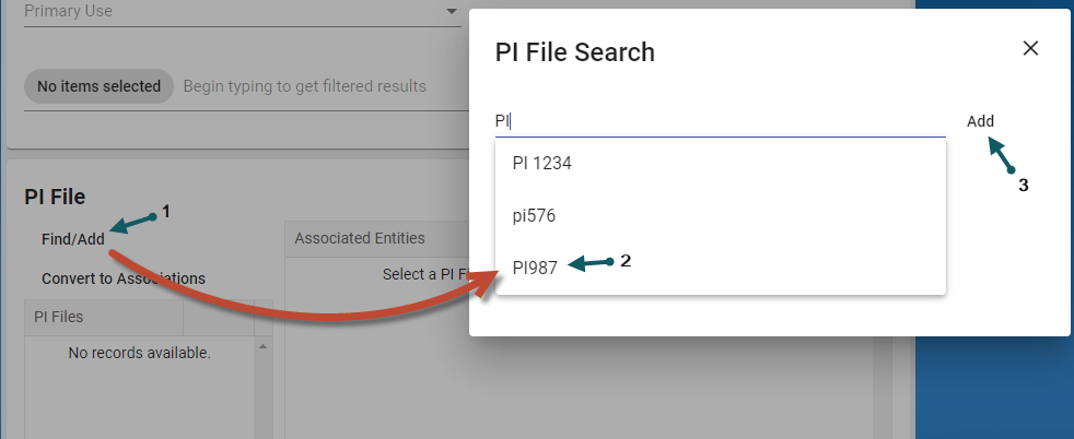 Add a PI File by clicking the Find/Add (1) button. Select a PI File (2), then select Add (3)