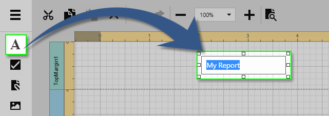 The horizontal and vertical rulers display tickmarks in the measure units specified for your report. Click an element to evaluate its size and location using the rulers.