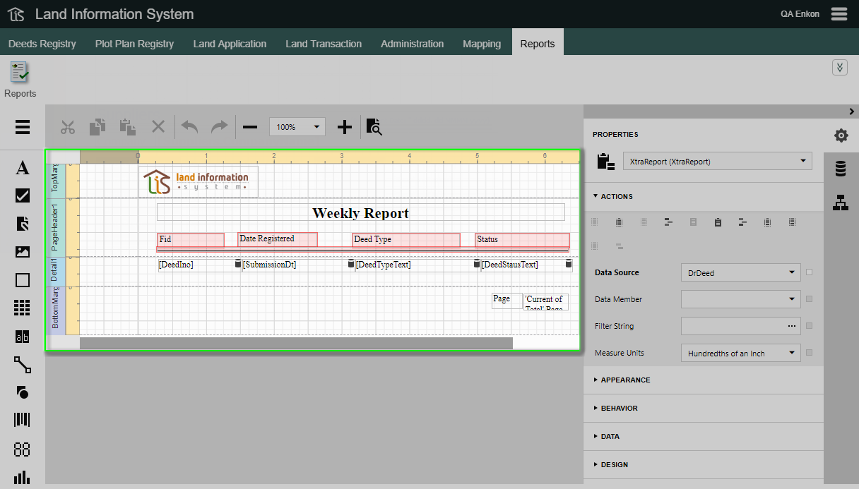 The Design Surface displays a report that is being edited in the 'Report Designer'.