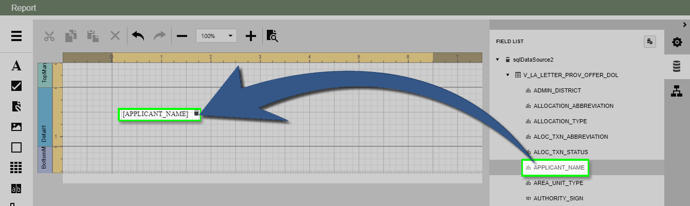 The Field List lists available report data sources and displays their structure. Dragging a field from the Field List onto the Design Surface creates a new Label bound to that data field.