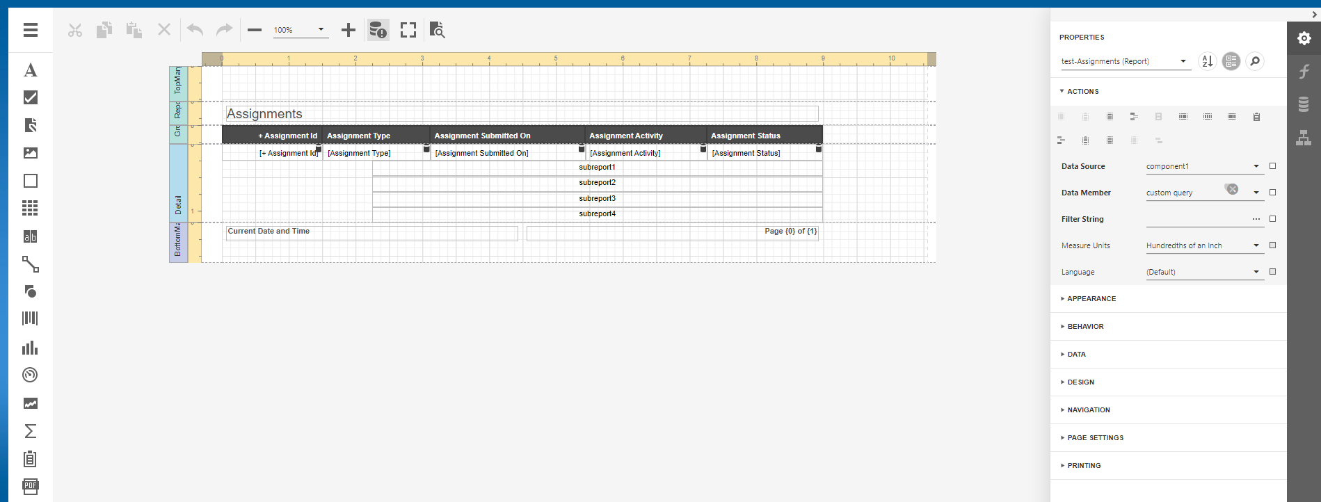 The vertical ruler shows resizing rectangles for every report band, which you can move to change the band height.