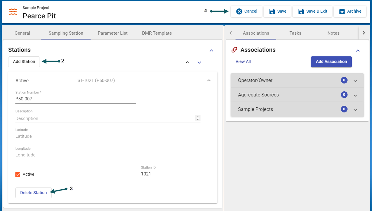 A station can be added (2) or deleted (3), once finished the changes can be cancelled, saved or the record can be archived (4)