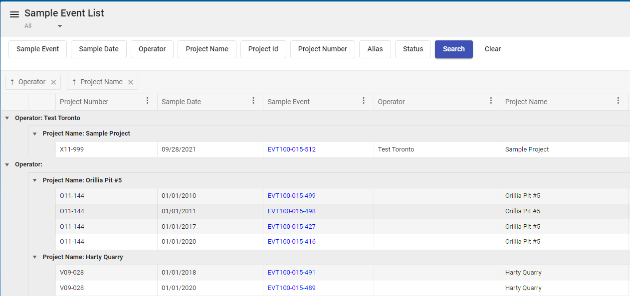 The purpose of the Sample Events module is to maintain and organize a list of all sample events along with their sampling station and sample results. Details include test facility, geolocation and operators.